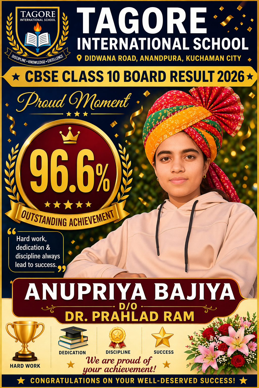 टैगोर इंटरनेशनल स्कूल, कुचामन सिटी के विद्यार्थियों ने इस वर्ष CBSE कक्षा 10 बोर्ड परीक्षा में उत्कृष्ट प्रदर्शन करते हुए विद्यालय का नाम गौरव से ऊँचा किया है। विद्यार्थियों की कड़ी मेहनत, अनुशासन और समर्पण ने एक बार फिर यह सिद्ध कर दिया कि सफलता निरंतर प्रयास और सही मार्गदर्शन का परिणाम होती है।